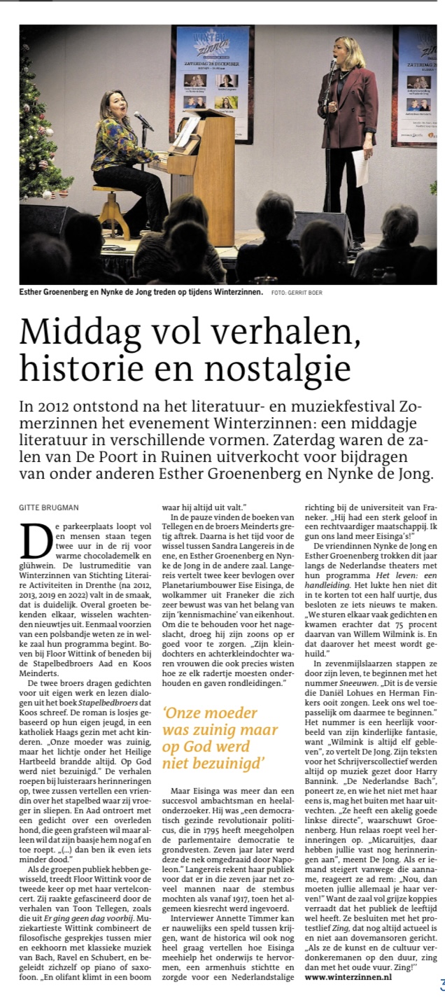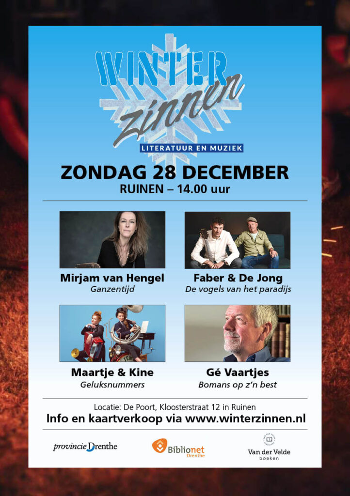 Stichting Literaire Activiteiten in Drenthe brengt schrijvers, muzikanten en publiek bij elkaar op de 6e editie van Winterzinnen. Zondag 28 december van 13.30-17.30 uur wordt in De Poort in Ruinen een middag gepresenteerd vol cultuur die verwarmt. Intieme verhalen, humoristische teksten, sfeervolle muziek en onverwachte ontmoetingen.